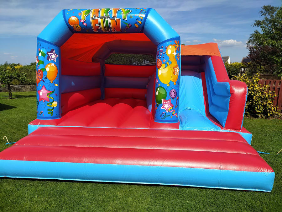 This party themed castle features a slide at the side, and is suitable for children aged 14 or under. It has a rain cover to keep your little bouncers dry all day, and the slide gives kids hours of fun bouncing around and sliding down! If you’re concerned whether this castle will fit in your garden, please give us a call.